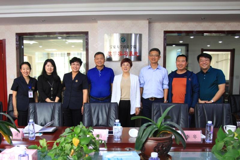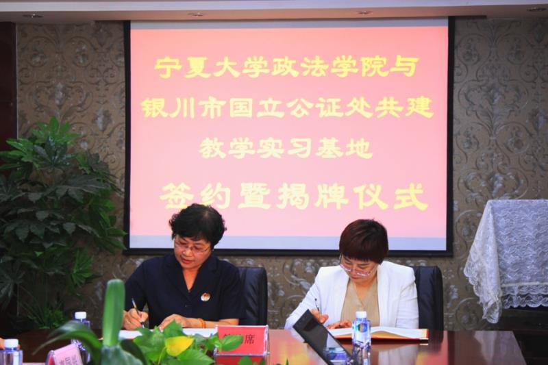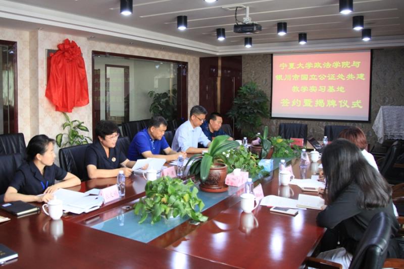 2017年9月19日,宁夏大学政新葡的京集团8814vip与银川市国立公证处共建教学实习基地签约暨揭牌仪式在银川市国立公证处举行。自治区司法厅律师公证处鹿守岩调研员、银川市司法局李卒副局长、银川市国立公证处于洧主任、银川市司法局公证律师管理科高国兴科长、政新葡的京集团8814vip潘瑞书记、政新葡的京集团8814vip胡世恩副院长、法律系张弛主任以及国立公证处各业务部门负责人共同出席了本次活动。