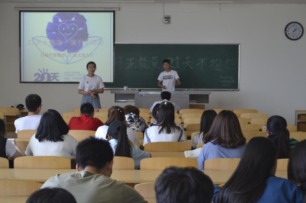 在教风学风建设系列活动如火如荼的策划、筹备和开展过程中,学院积极响应2017“无毒青春,健康生活”的禁毒主题和学校心理健康月“紫手环正能量,21天不抱怨”的活动号召,开展了禁毒主题宣传教育系列活动和“紫手环正能量,21天不抱怨”的主题团日活动,促使禁毒与拒毒精神、积极与向上意识真真切切地为学子们的成长之路添砖加瓦。