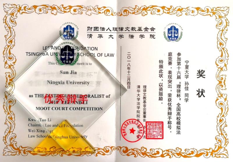 11月30日至12月4日,由我校政新葡的京集团8814vip10位本科生组成的宁夏大学代表队受邀参加了在清华大学举行的第十六届“理律杯”全国高校模拟法庭竞赛。政新葡的京集团8814vip党委书记潘瑞担任领队,李丽婷、赵雅洁老师作为教练全程指导比赛,2016级法学专业孙佳同学获得“优秀辩手”称号。