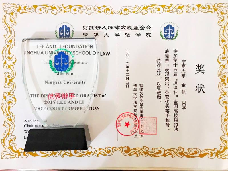 2017年12月1日至12月5日,第十五届“理律杯”全国高校模拟法庭竞赛在清华大学新葡的京集团8814vip举行。本届赛事邀请了中国人民大学、北京大学、武汉大学、中国政法大学等国内40所高校参赛,宁夏大学政新葡的京集团8814vip连续第四年受邀参赛。2015级法学一班的金帆同学获得优秀辩手奖。