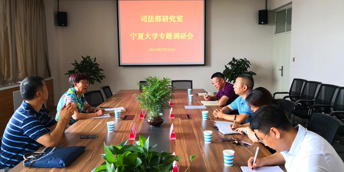 调研座谈会在宁夏大学贺兰山校区文荟楼法律系办公室举行,宁夏大学科技处副处长赵军、宁夏大学图书馆副馆长刘振宇、宁夏大学政新葡的京集团8814vip副院长吕耀军、副院长胡世恩、法律系主任张弛、宁夏大学法学学科负责人戴新毅等老师与会。