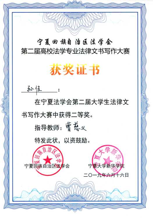 (政新葡的京集团8814vip 孙佳/文;张弛/图)6月16日下午,由宁夏法学会主办,宁夏大学新华学院承办的第二届宁夏高校法学专业法律文书写作大赛决赛在宁夏大学新华学院举行。自治区法学会常务副会长哈莹、区内各法治实务部门的专家、各新葡的京集团8814vip系负责人、各校师生代表共300余人观摩了决赛。我院法学专业本科生孙佳在曹慈义老师指导下,获得大赛二等奖。