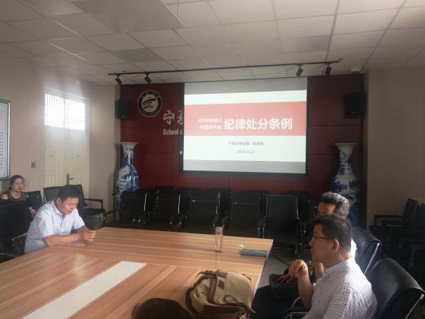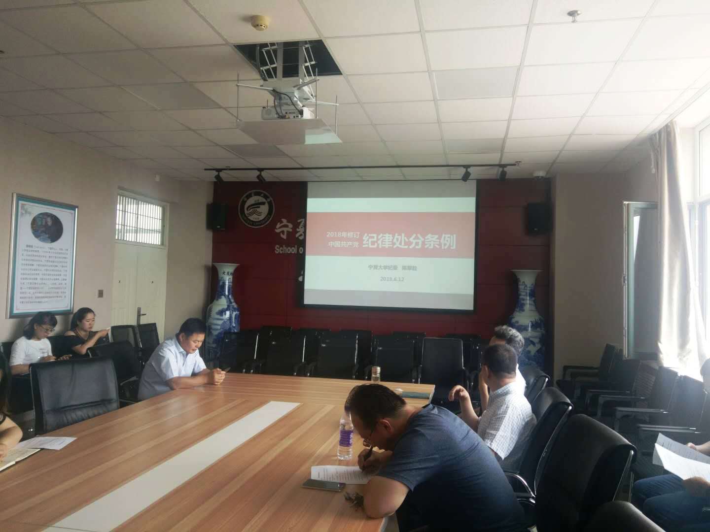 6月12日下午,宁夏大学纪委副书记陈军胜为政新葡的京集团8814vip全体教师党员做了题为“学习2018年新修订《中国共产党纪律处分条例》”的专题讲座。