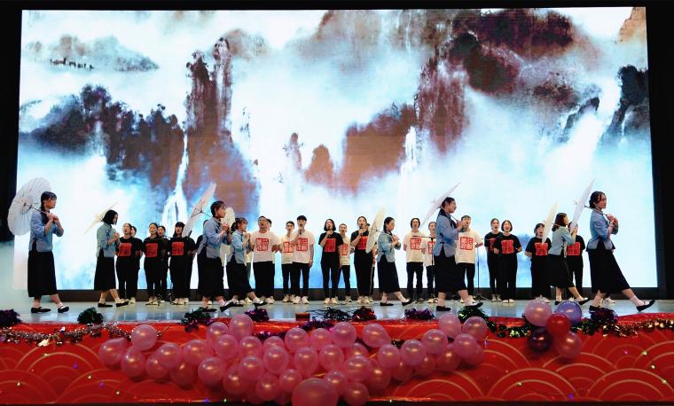 总结表彰结束后,欢送毕业生文艺晚会在激情四射的开场舞中正式开始。四载时光飞逝过,一朝欢聚话真情。校关工委老教师艺术团为师生们献上民乐合奏《遍地红花开》、《宁夏数花》及宁夏说唱《规矩与方圆》,老教师们精彩的表现让大家倍受鼓舞。歌舞《送别》、配乐诗朗诵《相逢离别都是歌》引起同学们内心深处的共鸣。政新葡的京集团8814vip潘瑞、胡世恩、潘素洁等老师带来的快闪《我和我的祖国》,用深情地演唱讴歌祖国发展巨变,献礼新中国成立七十周年,将气氛推向高潮,老师们满怀热情的歌声萦绕在活动中心现场,全场掌声雷动。最后,晚会在合唱《你好,再见》中缓缓落幕。