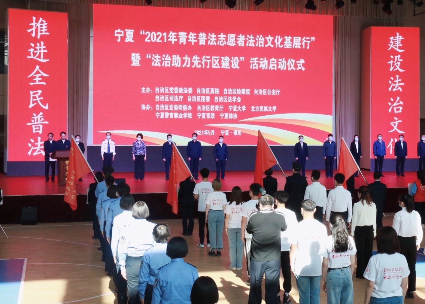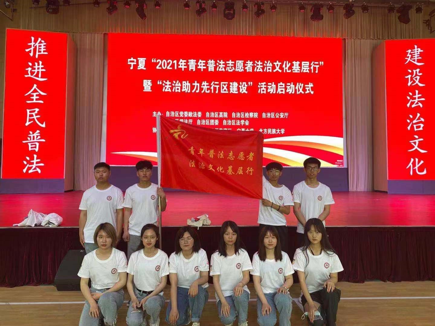 5月19日上午,由自治区党委政法委、自治区高院、自治区检察院、自治区公安厅、自治区司法厅、自治区团委、自治区法学会主办,自治区党委网信办、自治区教育厅、宁夏大学、北方民族大学、宁夏警官职业学院、宁夏青联、宁夏律协承办的宁夏“2021年青年普法志愿者法治文化基层行”暨“法治助力先行区建设”活动启动仪式在宁夏警官职业学院警体馆举行。我院10名青年学生普法志愿者代表学校参加本次活动。