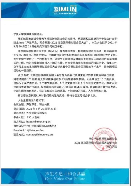 日前,由我院3名学生组成的宁夏大学国际关系学会代表队,于2021年5月20日至23日赴京参加由外交学院主办,外交部、教育部、共青团中央、中国联合国协会指导的2021北京国际模拟联合国大会。