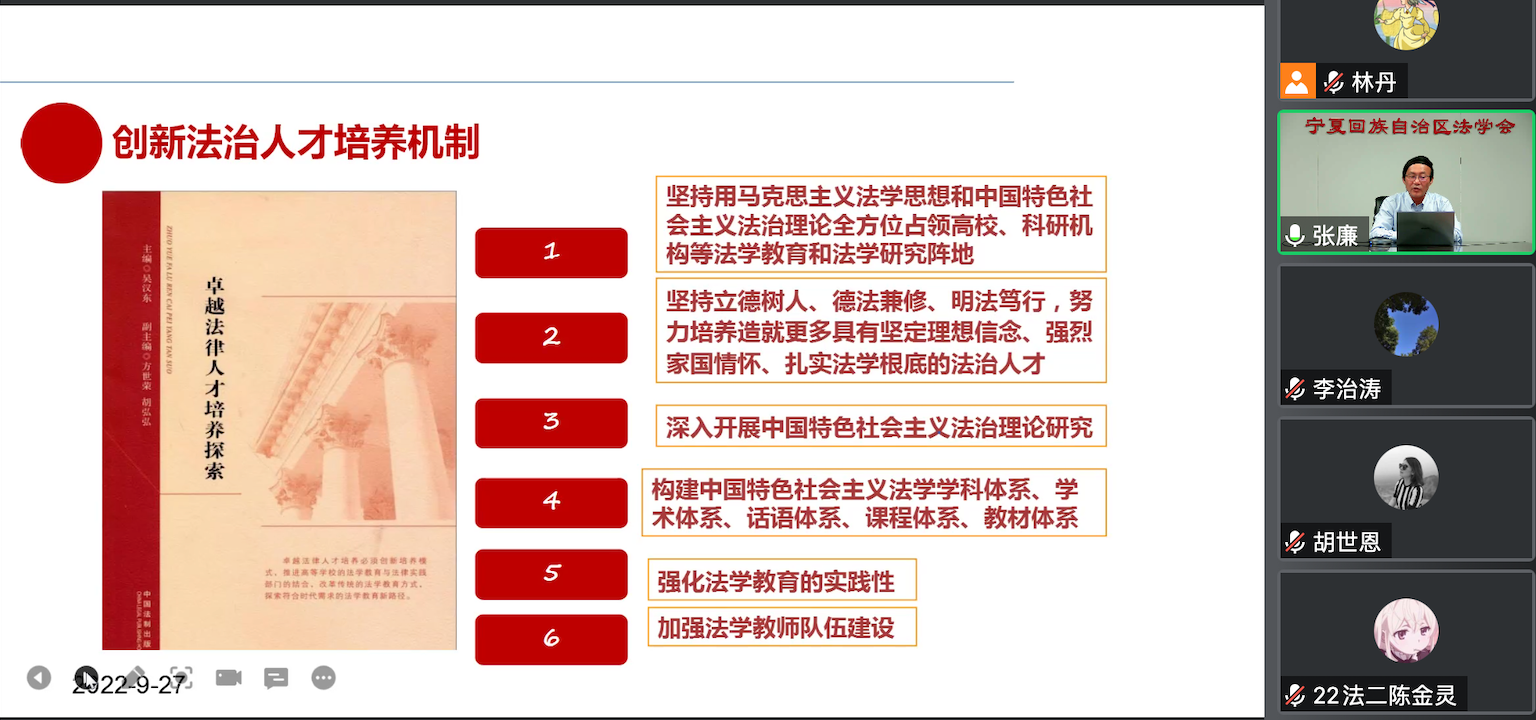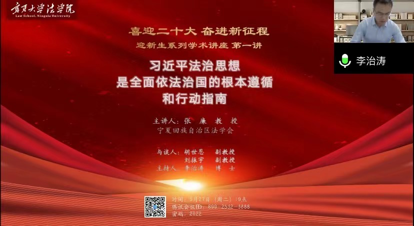 为深入推进习近平法治思想进校园、进课堂、进头脑,引导学院师生不断强化理论武装,深刻领悟“两个确立”的决定性意义,不断增强“四个意识”、坚定“四个自信”、做到“两个维护”,9月27日晚七点,新葡的京集团8814vip官方登录迎新生系列学术讲座精彩开讲,特邀宁夏回族自治区法学会党组书记、常务副会长张廉教授为全院师生带来首场题为《习近平法治思想是全面依法治国的根本遵循和行动指南》的线上讲座,深入解读习近平法治思想的重大意义、丰富内涵、科学方法