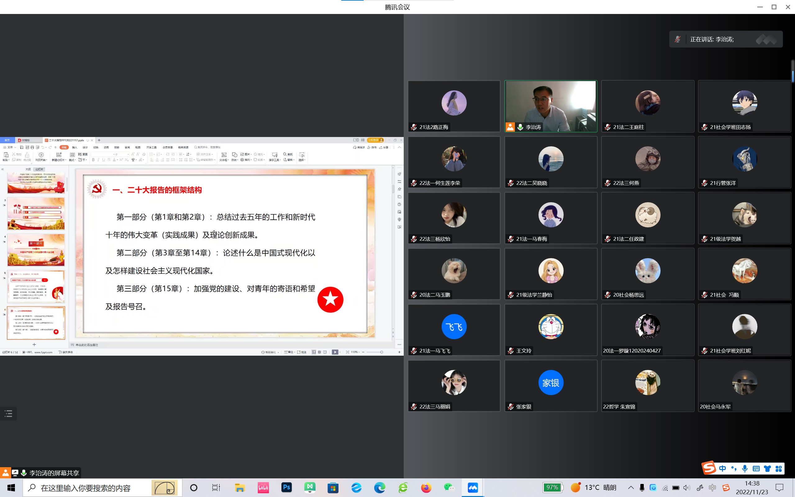 为切实贯彻落实党的二十大精神,充分发挥思想意识的引领作用。11月23日下午,学院举办学习党的二十大精神宣讲会,学院党委书记李治涛以“聚焦二十大,永远跟党走,奋进新征程”为题作辅导报告。我院2021级全体本科生、研究生,2020级班委及第十五期“青年马克思主义者培养工程”暨团学骨干培训班全体学员线上参会。