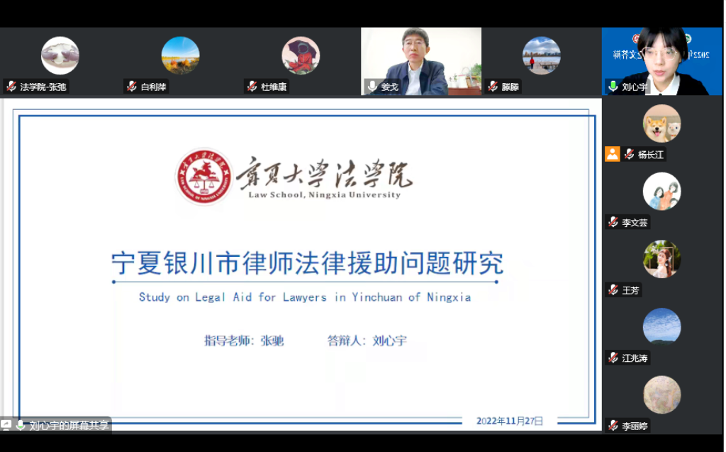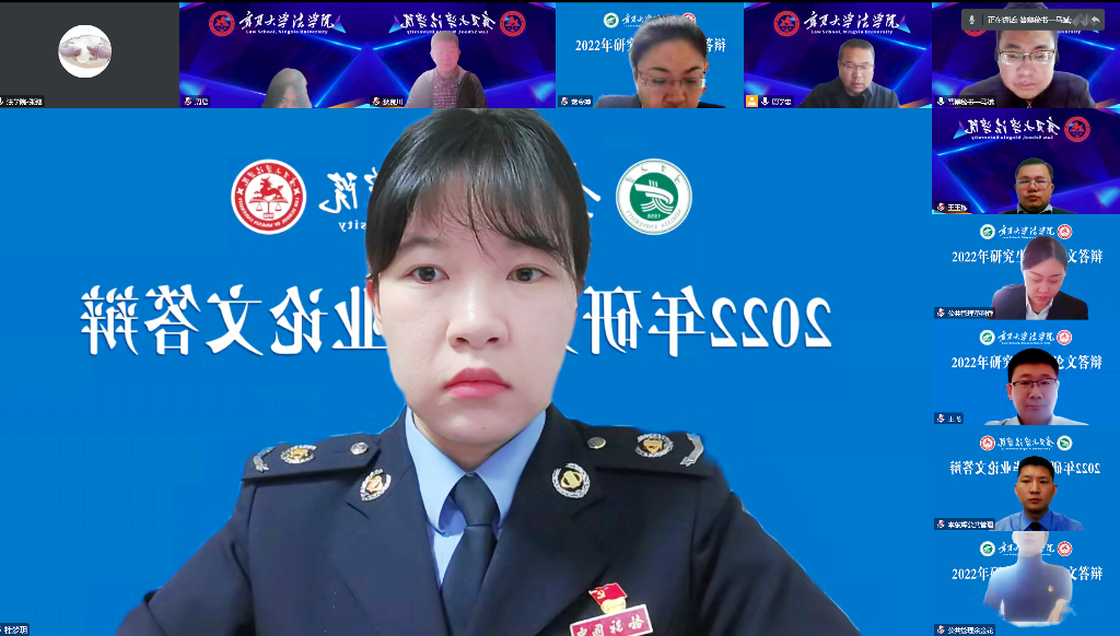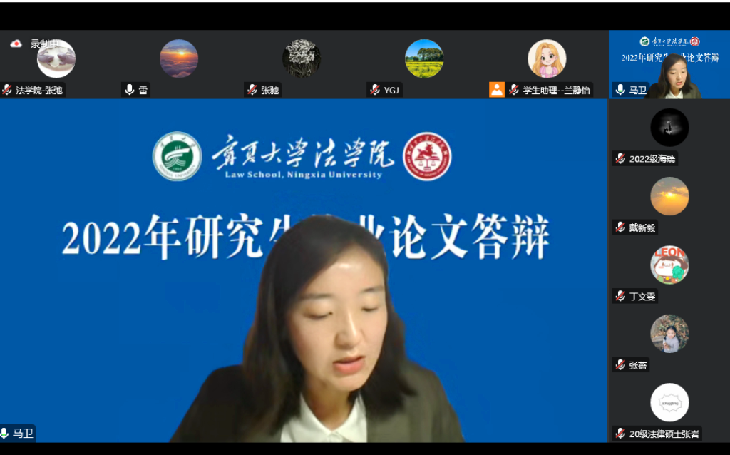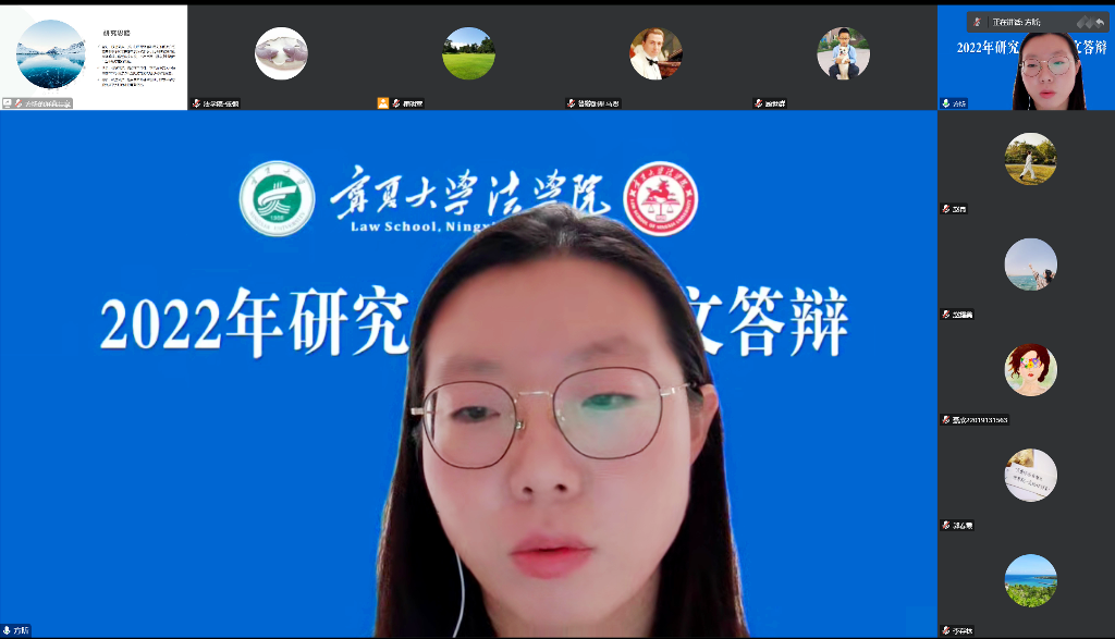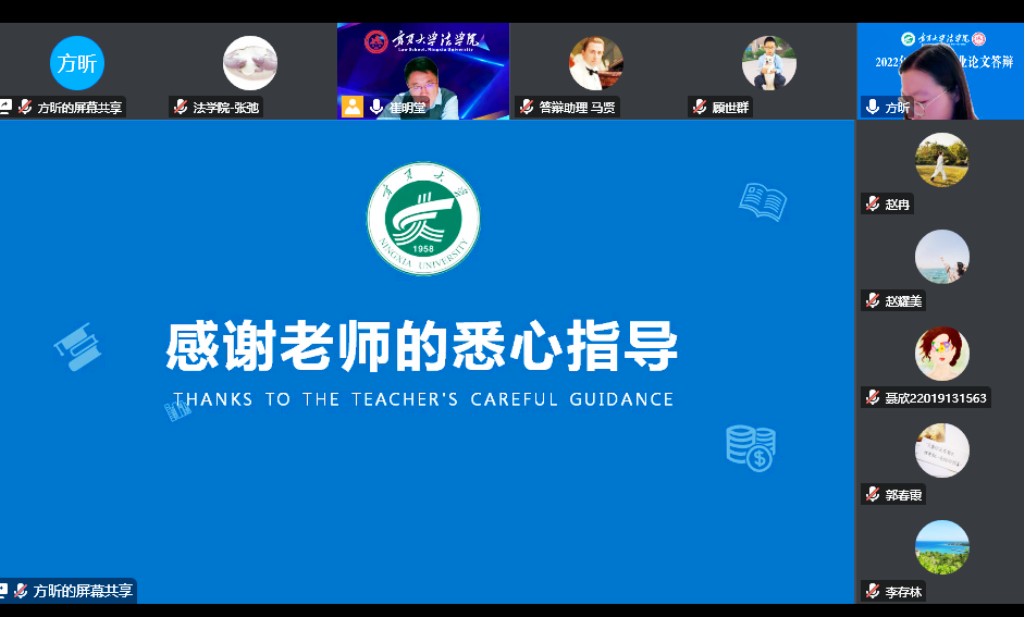 来自自治区高级人民法院、自治区司法厅、北方民族大学等单位的同行专家担任本届答辩委员会主席或委员。答辩会上,每位研究生从选题背景、研究方法与思路、研究内容、创新点及成果等方面进行了详细阐述,答辩委员会委员逐一进行点评和提问,并就进一步完善论文提出指导性意见和建议。答辩委员会认为新葡的京集团8814vip官方登录专业硕士研究生的学位论文选题以我区经济社会以及法治建设实际需求为背景,以问题导向开展应用研究,体现了专业硕士研究生综合运用科学理论、方法和技术解决实际问题的能力,具备了专业硕士的基本素养。