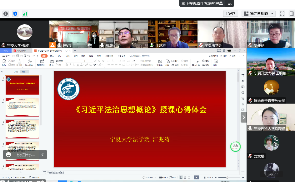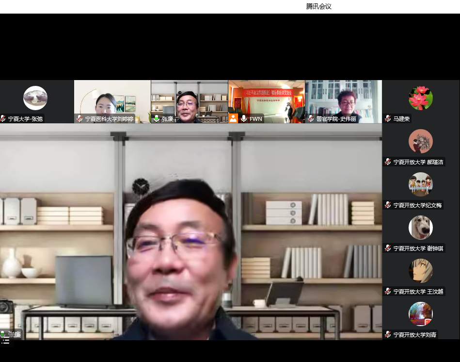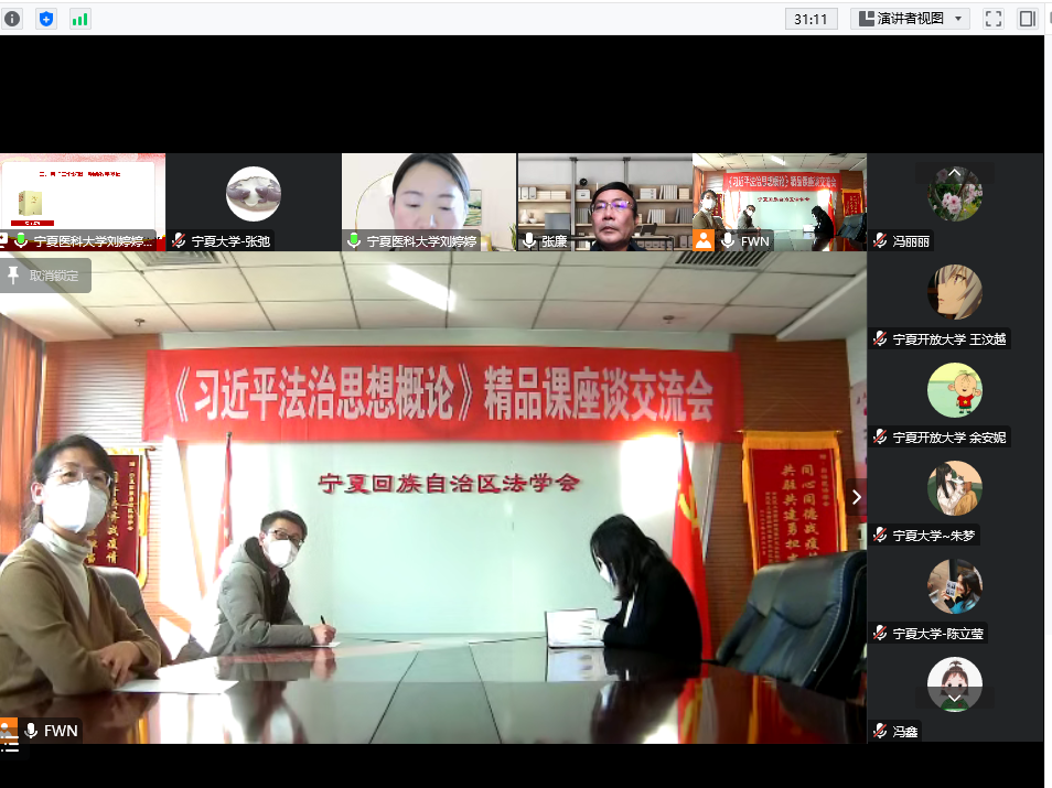 会议采取线上线下相结合的方式举行。精品课授课教师代表宁夏开放大学马克思主义学院王顺和、新葡的京集团8814vip官方登录江兆涛、宁夏警官职业学院史伟丽、宁夏医科大学马克思主义学院刘婷婷分别作了教学实践交流。