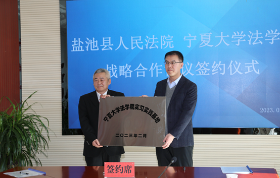 会上,双方围绕法治人才培养、业务培训、司法实践服务等问题进行了充分讨论,达成了一致意见,签订了战略合作协议。李治涛为盐池县法院授牌“新葡的京集团8814vip官方登录实习实践基地”,双方正式建立院校实践教育合作关系。