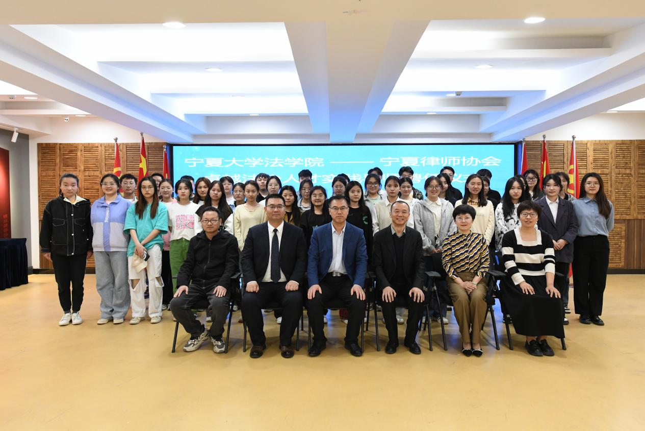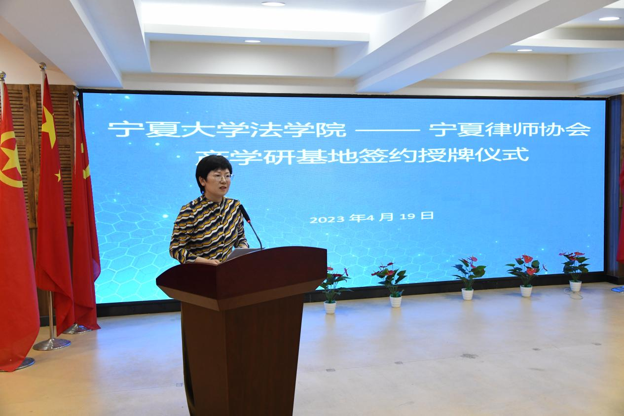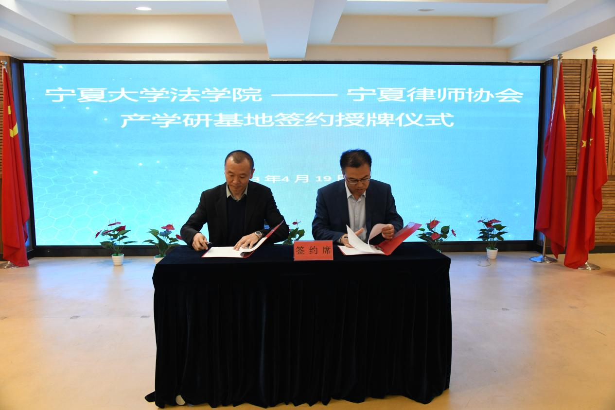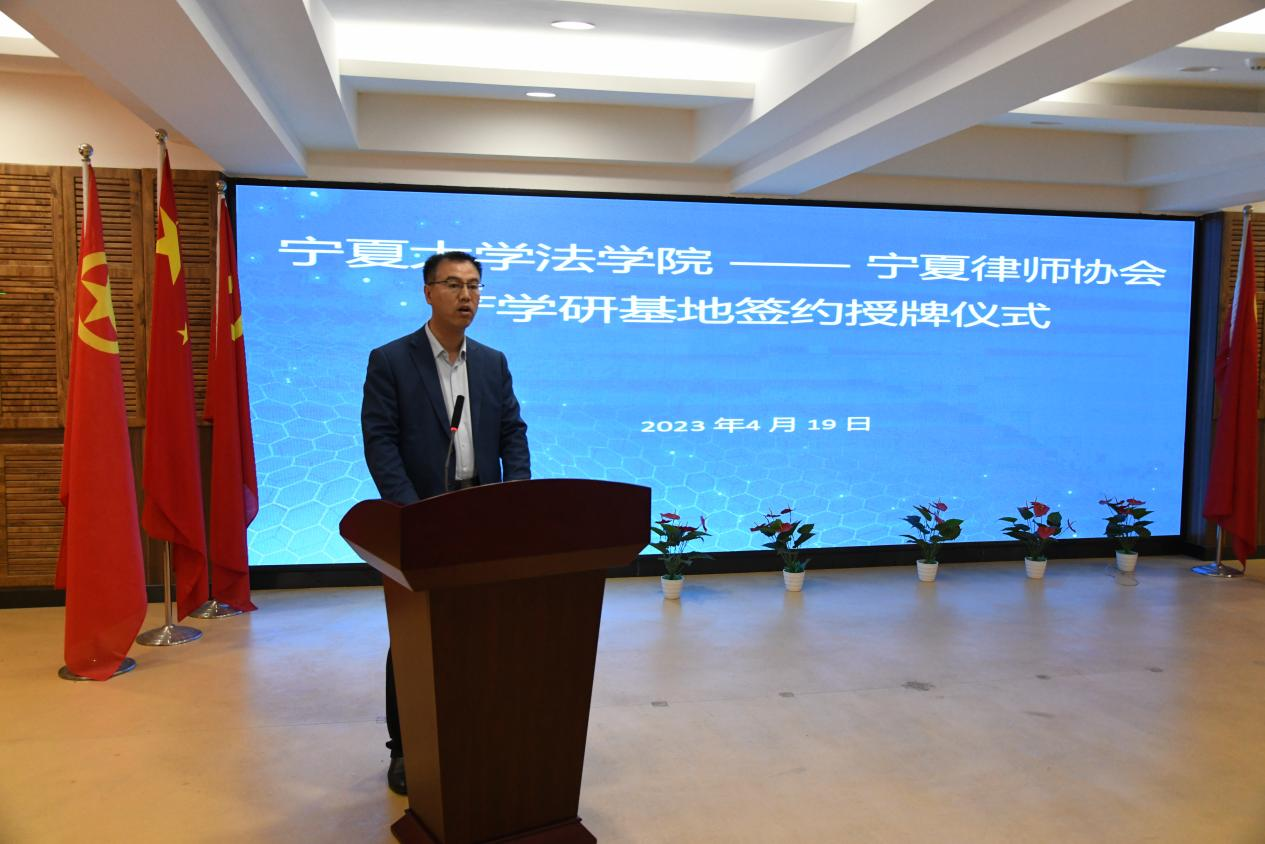 2023年4月19日,新葡的京集团8814vip官方登录与宁夏律师协会产学研基地授牌暨卓越法治人才实践导师聘任仪式在银川市律师行业党群活动中心举行。宁夏律师协会会长刘建国、新葡的京集团8814vip官方登录党总支书记李治涛、银川市律师协会副会长王建军、法律系教师胡世恩、朱蓓予、何磊和卓越法治人才培养班全体学生出席仪式。本次会议由王建军副会长主持。