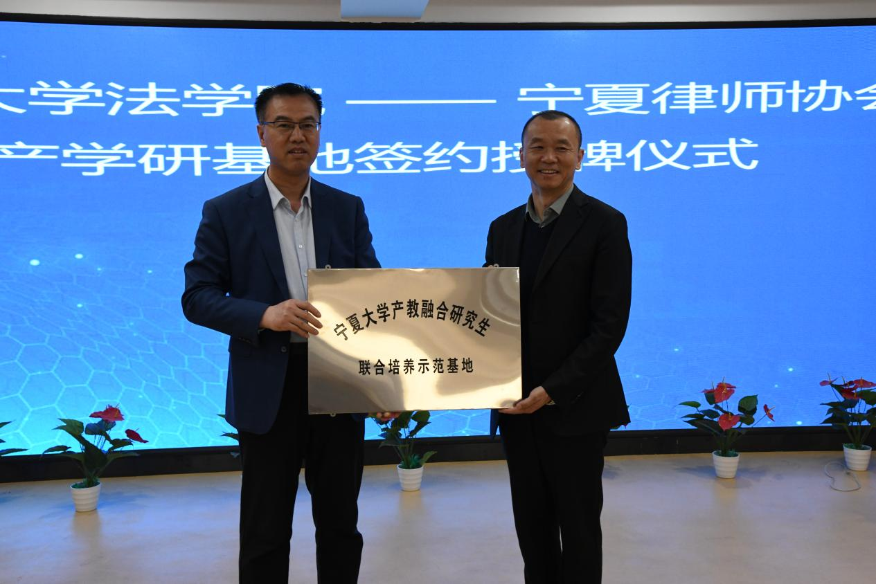 李治涛和刘建国代表双方签订合作协议并共同为宁夏律师协会产学研基地、宁夏大学产教融合研究生联合培养示范基地和新葡的京集团8814vip官方登录实习实训基地授牌,接下来由胡世恩宣布卓越班学生名单和聘任刘建国等十位实践导师聘任决定。