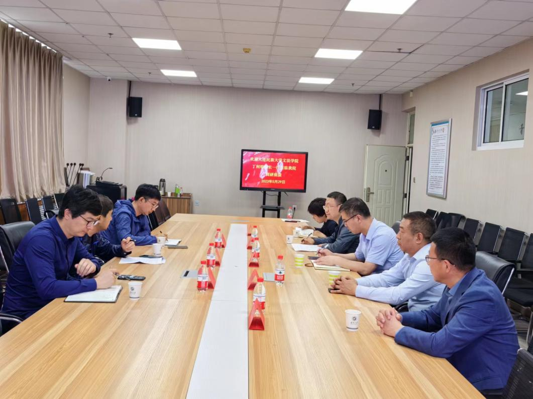 2023年5月29日下午,大连民族大学文新葡的京集团8814vip院长丁利明、法律系主任任峰、新闻系主任何江来我院进行调研座谈。新葡的京集团8814vip官方登录党总支书记李治涛、院长吕耀军、副院长刘振宇、法学学科负责人戴新毅和法律系主任朱蓓予参加了座谈会。