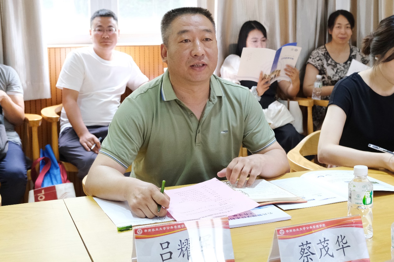 之后,杨正喜详细汇报了华南农业大学公共管理学院近5年本科专业的学科建设、学生规模、培养方式、导师制度、学科竞赛、国家一流本科建设等情况。杨正喜特别提到,国家一流本科专业建设要鼓励教师分任务、领任务,学院自己探索出了一条“三三制”经验,教师根据各自特长分别在科学研究、教学工作和社会服务三个方面贡献自己的力量。接下来,唐斌介绍了研究生培养情况,他表示公共管理学院现有研究生255人,研究生导师在二级学科之下按研究方向组建若干科研团队带领学生研学。学院在研究生培养方面积极举办“前沿学术论坛”、“学术工作坊”、“研究生工作坊”、“研究生调研汇报”等活动,营造学术氛围,激励学术热情,还设立“荣誉自习室”、购买“哲寻”虚拟仿真软件,努力为学生提供良好的软硬件设备。张玉教授热情洋溢地为大家介绍了她自己的教学团队,以及她们团队打造国家一流课程的过程和经验。廖杨教授围绕国家一流课程建设、规划教材出版、名师团队组建、实习实践基地建设、教学成果大赛、学生就业升学等方面分享了自己的经验和感悟。武玉坤就如何提升在职专业硕士培养质量和论文写作水平介绍了学院的措施和经验。陈玉生就社会工作专业的最新建设,介绍了教学类大赛、教材编写、校地合作和学生就业等方面的经验和心得。