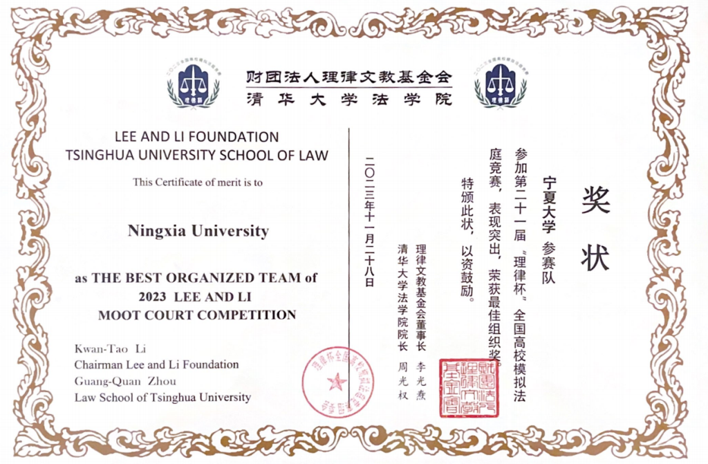 2023年11月24日至28日,由清华大学新葡的京集团8814vip主办,理律文教基金会协办的第二十一届“理律杯”全国高校模拟法庭竞赛在清华大学新葡的京集团8814vip成功举行。本次竞赛共有40所高校代表队参加,邀请了众多实务界和学术界的专家担任评委,以“新业态和平台经济下的民事纠纷”为模拟案件,围绕当前司法实务中的关键问题和争议焦点展开研讨与辩论。来自全国各地40所新葡的京集团8814vip校代表队在这场法律盛宴中,用精彩的表现为公众展示了卓越的法律才华。宁夏大学代表对荣获赛事“最佳组织奖”。宁夏大学代表由法学专业本科生组成,新葡的京集团8814vip张驰老师担任教练,新葡的京集团8814vip张弛老师担任领队,勤学书院与新葡的京集团8814vip联合保障了全程的备赛和参赛。