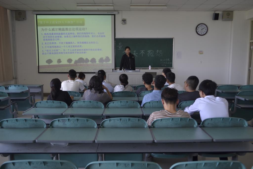 5月17日下午2点,政新葡的京集团8814vip2016级各专业以团支部为单位,在贺兰山校区文科楼315、332、334、336教室,组织开展了心理健康月“紫手环正能量 21天不抱怨”主题团日活动。