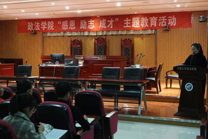 为了深入开展资助育人工作,加强对在校学生的励志教育,11月26日晚,政新葡的京集团8814vip在模拟法庭举办“感恩、励志、成才”主题教育活动。