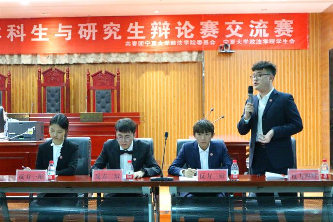 为加强政新葡的京集团8814vip本科生与研究生的交流,11月15日晚,由院团委主办,院学生会协办的“宁夏大学政新葡的京集团8814vip本科生与研究生辩论赛交流赛”在模拟法庭举行。院副院长尹强到场观看并作点评,辅导员赵南宁、院学生会、研究生会负责人、部分研究生和2019级本科生参加了活动。