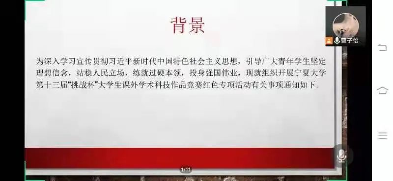 为响应校团委号召,动员新葡的京集团8814vip广大同学积极参加宁夏大学第十三届“挑战杯”大学生课外学术科技作品竞赛暨红色专项实践活动,学院团委于2021年1月26日下午组织各班团支部开展“触发科技灵感,展现红色生命”主题团日活动。