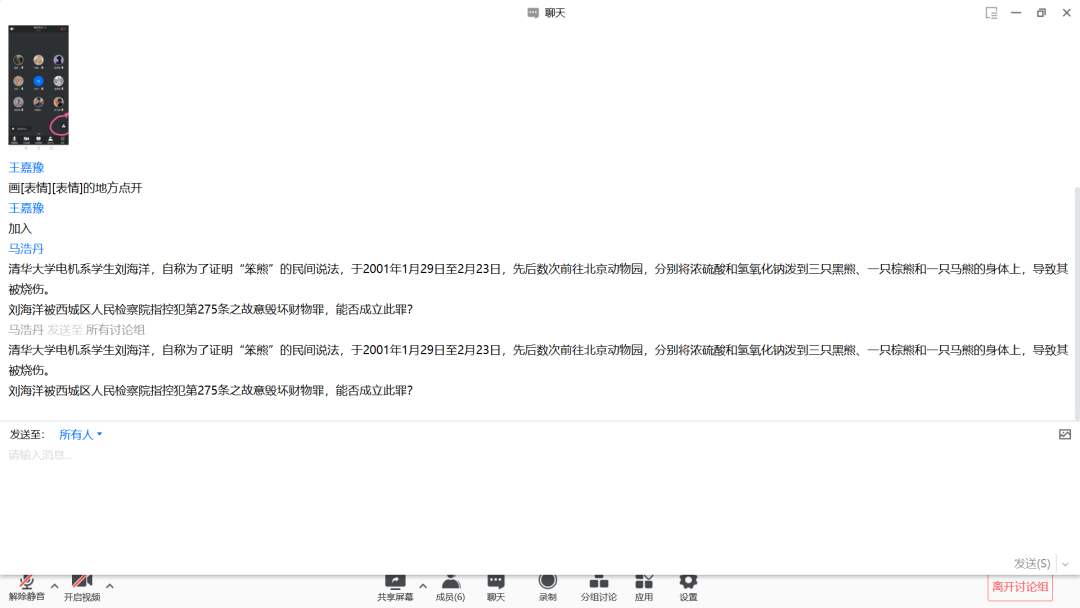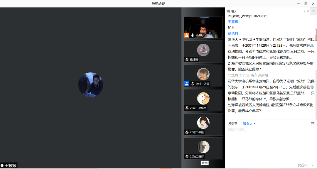 举“案”明理,阅“例”非凡,用法律之眼看世界。为提高线上教学质量,帮助同学们强化法学思维方式。11月5日下午新葡的京集团8814vip通过虚拟接待室的方式举办线上刑法案例研习活动。本次活动由马浩丹做主讲人,新葡的京集团8814vip学生工作办公室主任王嘉豫出席研习会,部分2020级本科生参加此次活动。