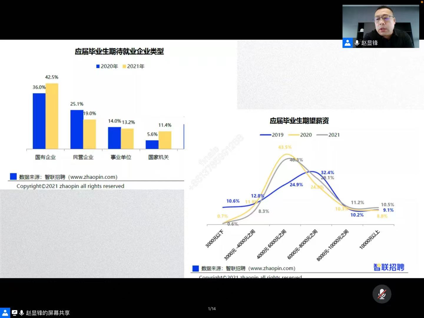 活动伊始,赵显锋从应届毕业生去向数据、应届毕业生意向企业类型、期望薪资和求职热门城市等多个方面分析了疫情状况下的就业形势。他指出,受疫情影响,目前企业提供的岗位数量减少,由此产生了大量待业人员,就业竞争激烈,求职难度大。随后,他从企业的角度出发,对大学生的培养提出几点建议。他分析了疫情过后企业急需的人才类型,并指明企业在招聘时除看中专业技能外,同样重视应聘人员的语言表达能力、沟通判断能力、数据分析与处理能力、线上办公系统操作能力和公文写作能力等等,这些都是毕业生在应聘时需要具备的重要技能。最后,赵显锋强调应当注重培养在职场中能长期提供价值的听说读写能力、逻辑能力、自主学习能力,有助于提高应届毕业生的求职竞争力。