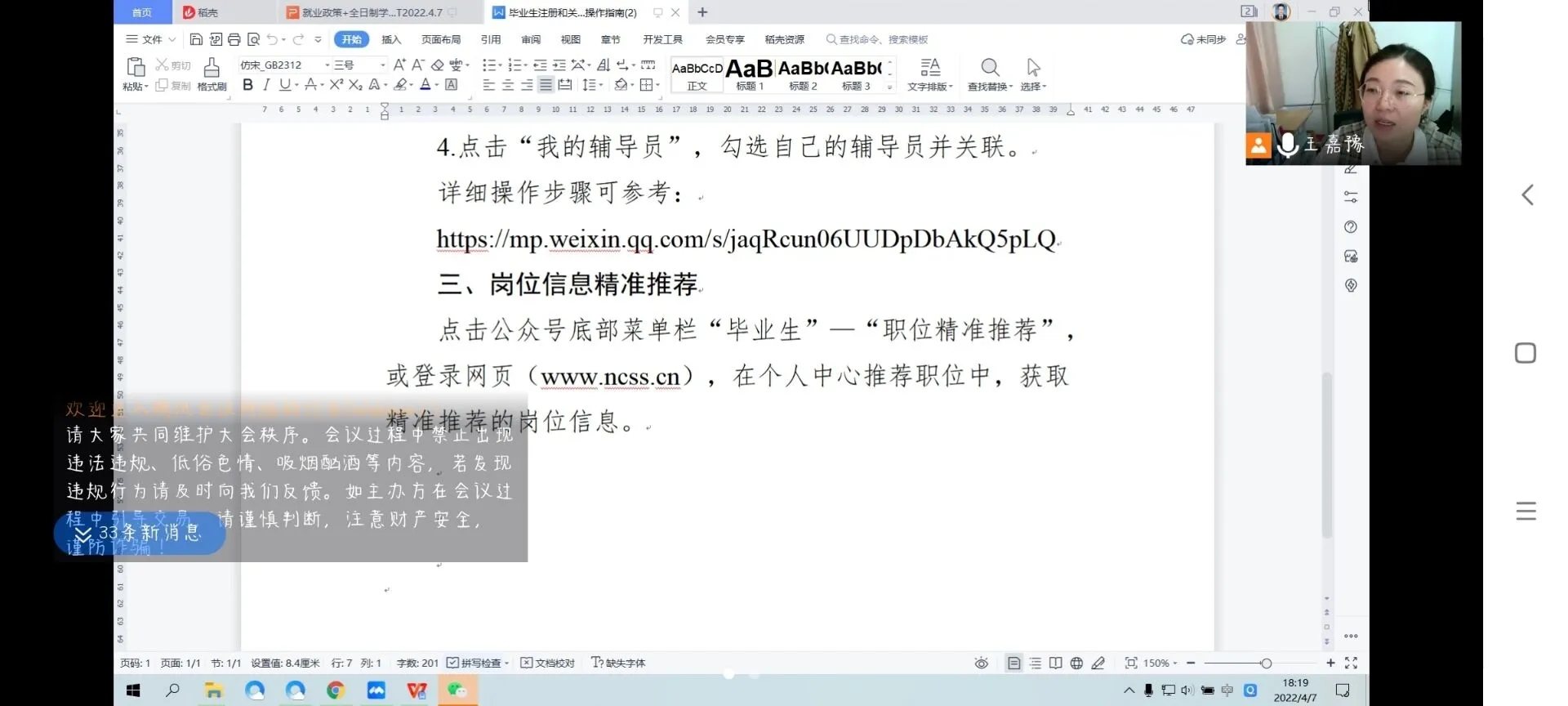 为提供精准就业创业指导服务,扎实推动2022届毕业生就业创业工作,4月7日下午,我院面向2022届毕业生开展以“2022年高校毕业生就业创业政策宣讲”为主题的宣讲会。会议由学生工作办公室主任王嘉豫主持,采用腾讯会议的形式召开,全体2022届毕业生参会。