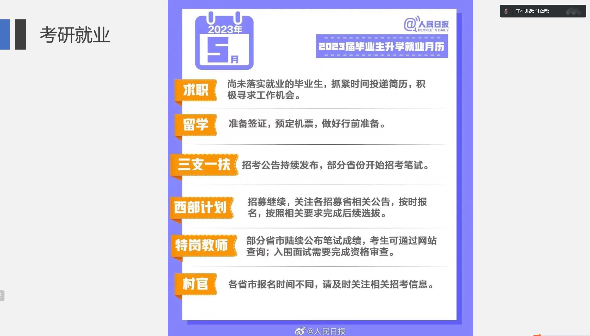 会议伊始,付晓晨就近期疫情防控情况进行介绍,叮嘱同学们遵守疫情防控相关要求,科学防疫,戴好口罩,核酸检测“应检尽检”;注意宿舍安全卫生及个人身心健康,劳逸结合;严格遵守校园封闭管理期间的各项规定。进而,付晓晨针对考研就业问题提出了宝贵的建议,并分享了自己的考研就业经历。通过自身的经验分享,告诉同学们要努力提升自身能力水平,不放过任何一次来之不易的机会,并提醒考研的同学注意考研报名时间节点,合理规划时间,科学备考,保持良好的心理状态。付晓晨还建议计划求职的同学要提高自己的求职竞争力,完善丰富求职简历,“擦亮双眼”注意鉴别单位,谨防诈骗,并提醒同学们紧密关注各大考研、就业信息平台发布的最新消息。最后,付晓晨就同学们提出的学习、生活中遇到的问题进行了解答。