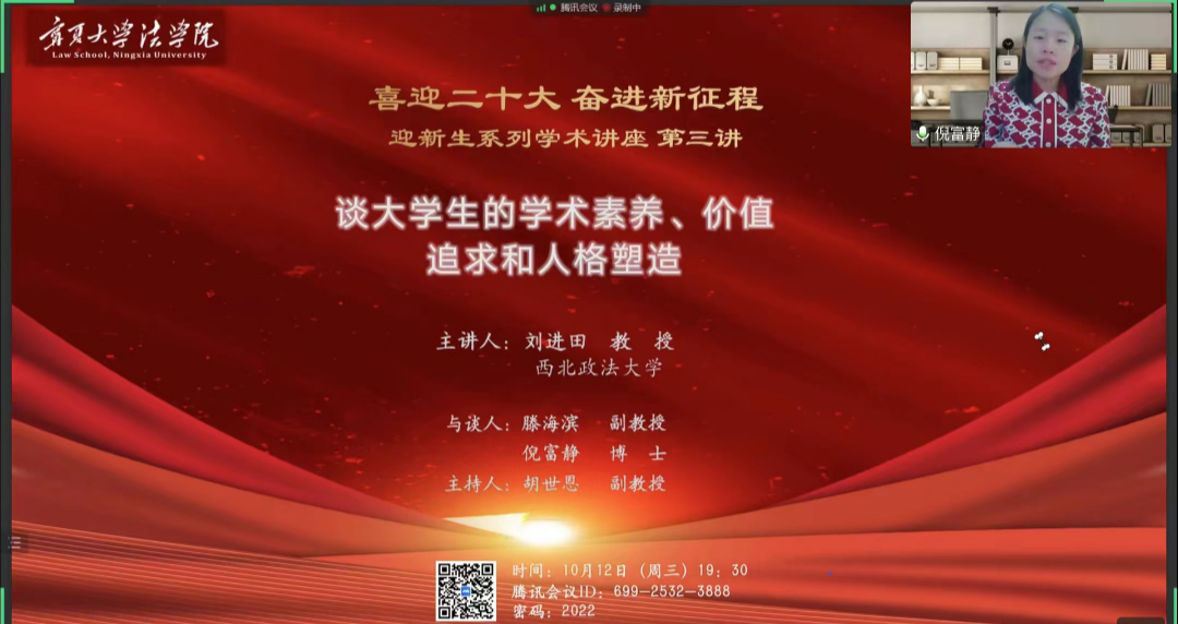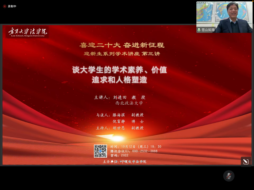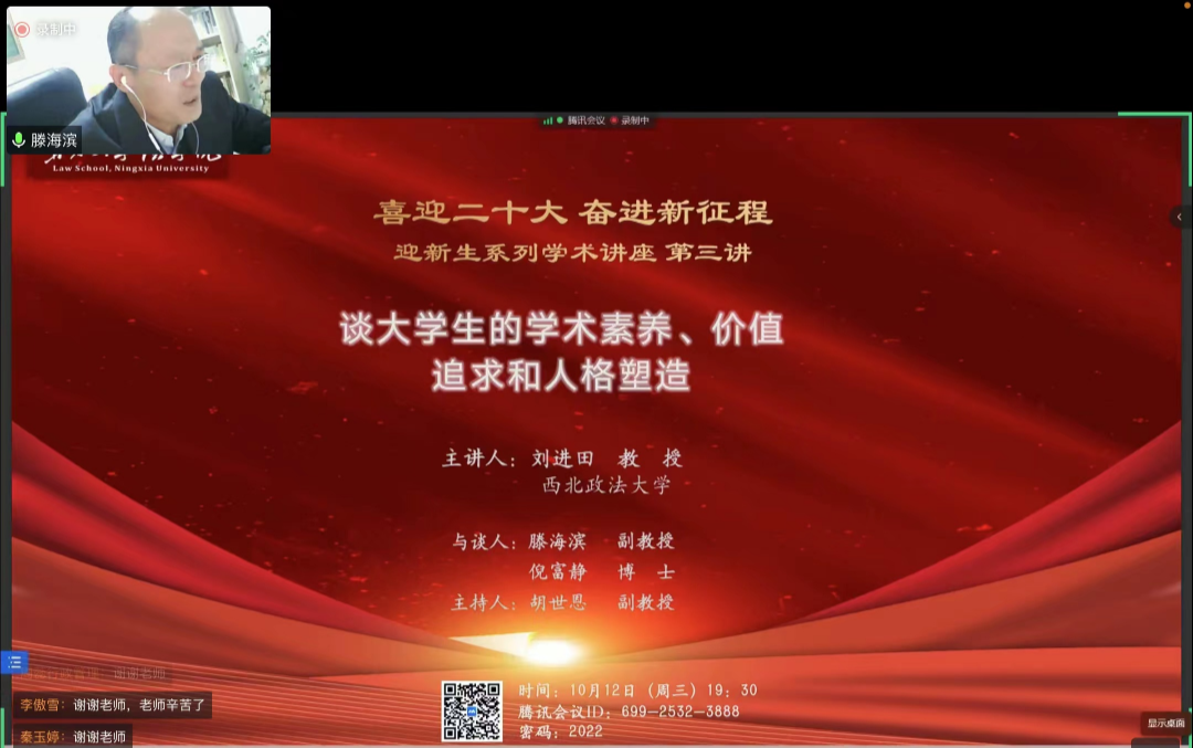 10月11日晚7:30,我院特邀西北政法大学文化与价值哲学研究院院长刘进田教授带来题为《谈大学生的学术素养、价值追求和人格塑造》的线上讲座。本次讲座由副院长胡世恩主持,滕海滨副教授和倪富静博士为与谈人。