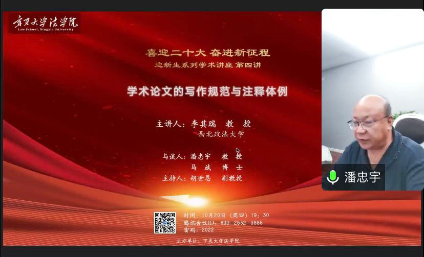 10月20日晚7:30,学术讲座第四讲围绕“学术论文的写作规范与注释体例”展开。本次讲座特邀西北政法大学法治文化研究中心主任、马克思主义法学研究所所长李其瑞教授担任主讲嘉宾,我院副院长胡世恩主持,潘忠宇教授、马斌博士出席并担任与谈嘉宾。