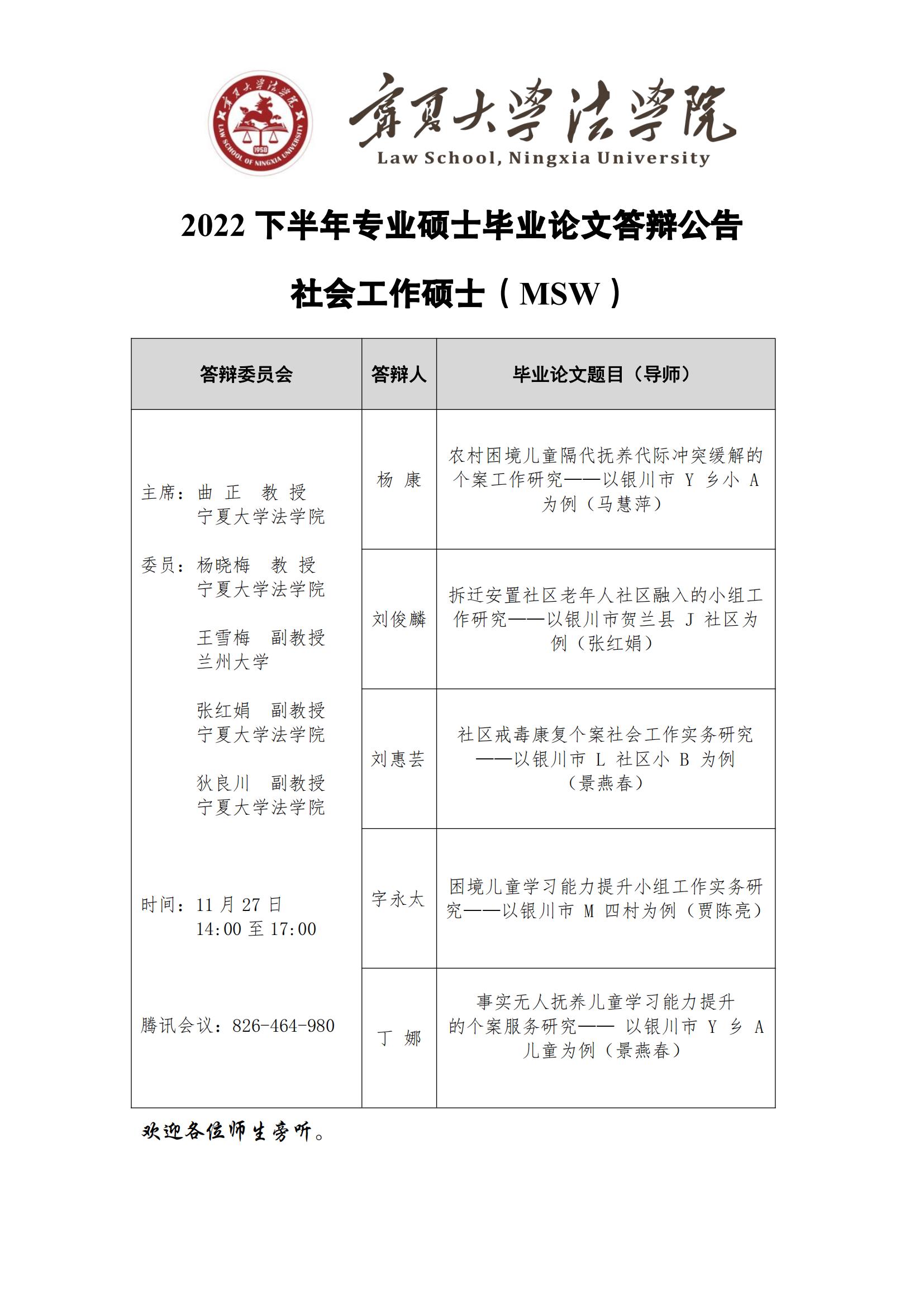 新葡的京集团8814vip官方登录社会工作硕士(MSW)毕业论文答辩公告