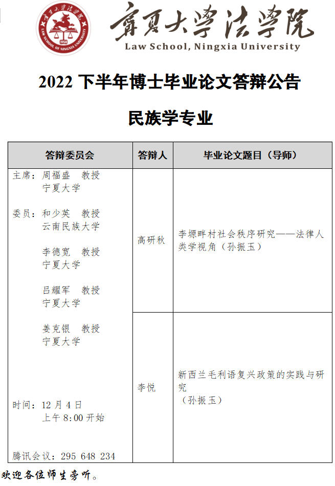 新葡的京集团8814vip官方登录民族学专业2022下半年博士毕业论文答辩公告