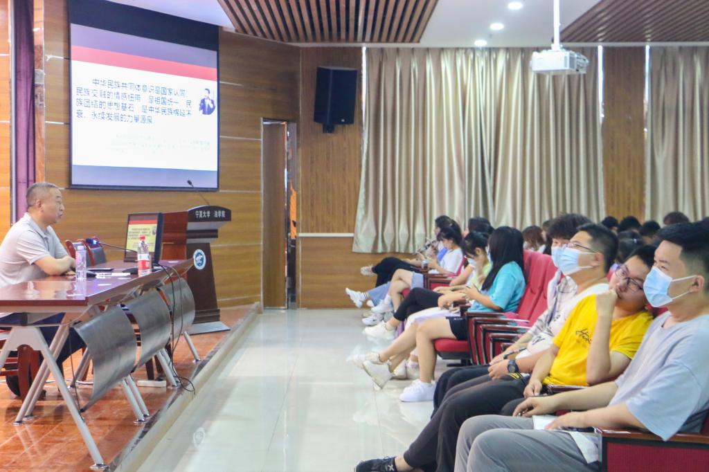 为深入学习贯彻习近平总书记关于民族工作的重要论述,认识铸牢中华民族共同体意识的现实意义。6月24日晚,新葡的京集团8814vip于文荟楼模拟法庭组织开展了以“传承党的百年光辉史基因,铸牢中华民族共同体意识”为主题的专题讲座。自治区宣讲团成员、新葡的京集团8814vip院长吕耀军做了报告,学院本科生、硕士研究生三百余人到场聆听。