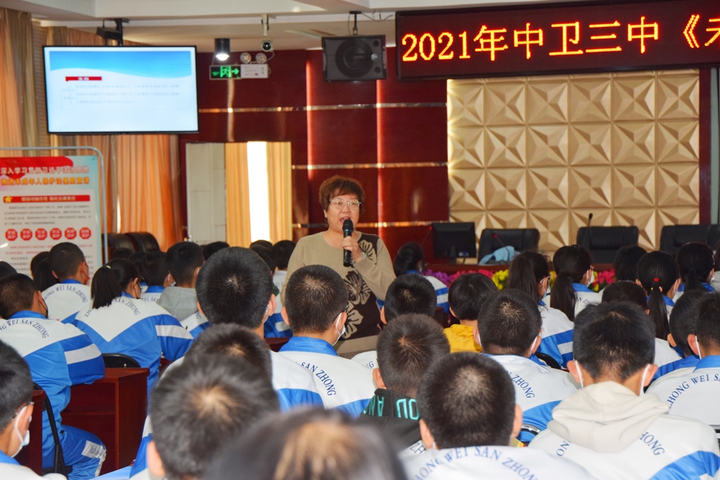 在宪法宣传日,以大学生为对象,宣讲习近平法治思想;以中小学师生为对象,普及《中华人民共和国未成年人保护法》,大力营造全社会关爱保护未成年人健康成长的浓厚氛围,协助中卫市进一步增强社会主义法治文化建设和法治校园建设,让法治宣传教育在基层强起来、实起来、暖起来。