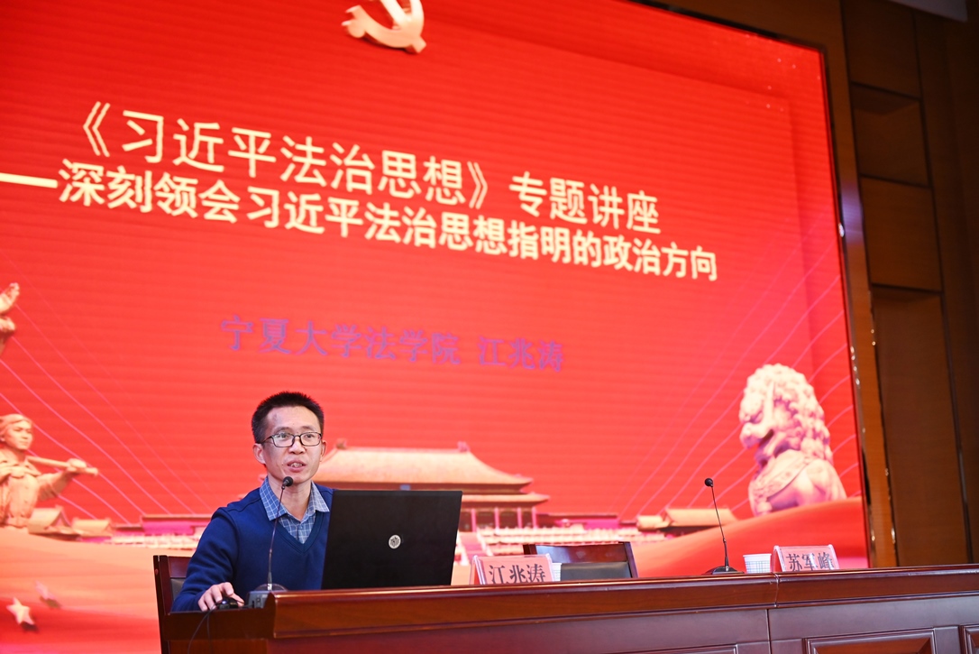 习近平法治思想专题辅导讲座由新葡的京集团8814vip副教授江兆涛主讲。他以“十一个坚持”为主要内容,指出习近平法治思想以辩证唯物主义和历史唯物主义为重要基础,深刻回答了社会主义法治建设系列重大问题,为推进全面依法治国提供了基本遵循。要坚持习近平法治思想,深入推进全面依法治国,不断开创新时代法治中国建设新局面,为全面建设社会主义现代化国家、实现中华民族伟大复兴的中国梦而不懈奋斗。